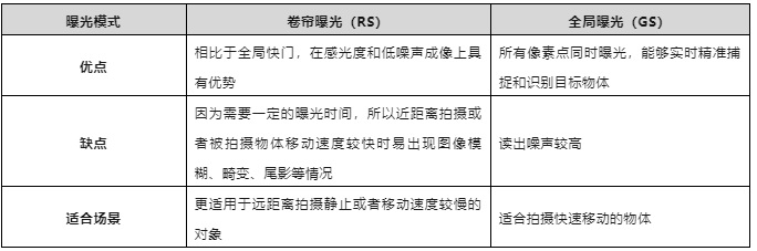 卷簾曝光(RS):在曝光開始時(shí),感光組件會(huì)逐行或逐列進(jìn)行掃描并曝光,直至感光組件上所有像素點(diǎn)都完成曝光為止,但是每行或每列之間的曝光存在一定的時(shí)間差。