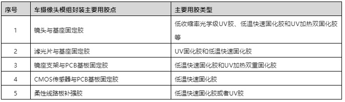 圖表20. 車載攝像頭模組封裝主要用膠點(diǎn)及用膠類型
