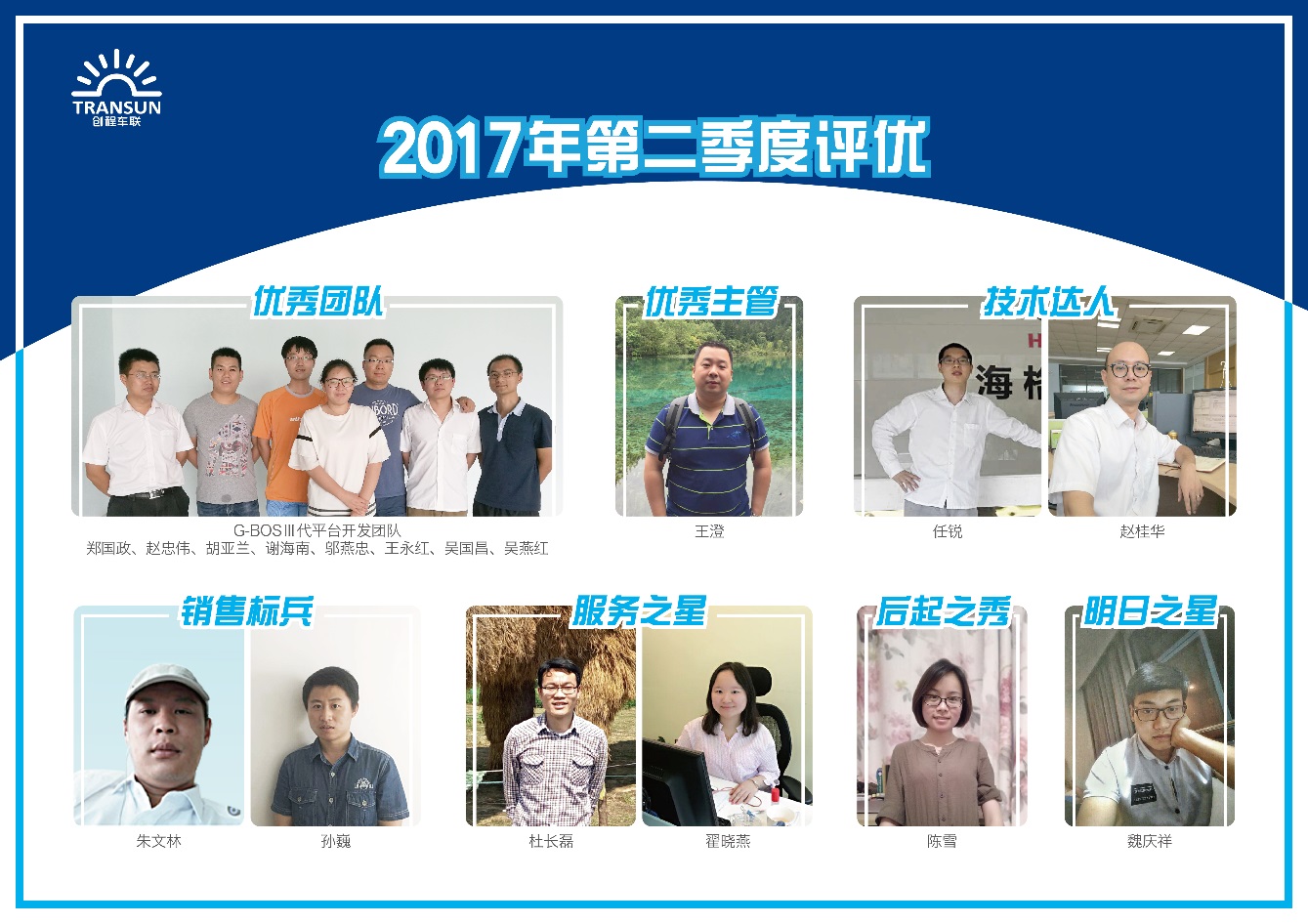7月31號,第二季度優(yōu)秀員工評選活動已圓滿落下帷幕,經(jīng)過一輪輪的篩選,一批優(yōu)秀員工登上了光榮榜:優(yōu)秀團隊G-BOSⅢ代平臺開發(fā)團隊、優(yōu)秀主管王澄、技術達人任銳和趙桂華、銷售標兵朱文林和孫巍、服務之星杜長磊和翟曉燕、后起之秀陳雪、明日之星魏慶祥,在此,我們一睹他們的風采。
