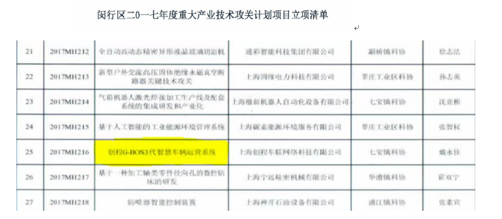 2017年11月8日,上海創(chuàng)程喜獲上海市閔行區(qū)科學(xué)技術(shù)委員會2017年重大產(chǎn)業(yè)技術(shù)攻關(guān)計劃項目資金支持。