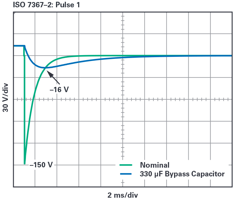 在最近的迭代中,ISO 7367-2電磁兼容規(guī)范主要介紹來自相對較高的阻抗源(2 Ω至50 Ω)的大幅度(>100 V)、短時持續(xù)(150 ns至2 ms)瞬變。這些電壓峰值通??梢允褂脽o源組件消除。圖1顯示定義的ISO 7367-2脈沖1,以及增加的330 μF旁路電容。電容將尖峰幅度從–150 V降低至–16 V,完全在反向電池保護電路支持的范圍內(nèi)。ISO 7367-2脈沖2a、3a和3b的能耗遠(yuǎn)低于脈沖1,所需的抑制電容也更少。