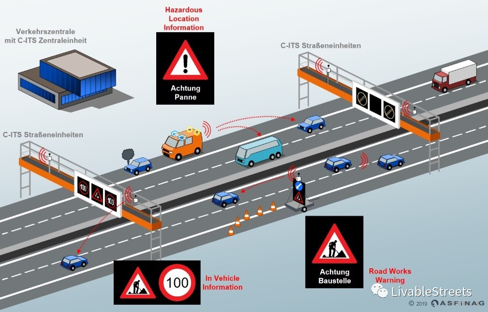 奧地利ASFiNAG的C-ITS戰(zhàn)略,圖中包括了:1. 集成C-ITS中央設(shè)備的交通控制中心,2. 移動(dòng)車輛發(fā)布的危險(xiǎn)地點(diǎn)信息:“注意,前方事件!”,3. 施工車輛發(fā)布的道路施工預(yù)警:“注意,前方施工!,4. 車內(nèi)收到的信息“施工,臨時(shí)限速100”,以及5. 龍門架上的C-ITS設(shè)備單元
