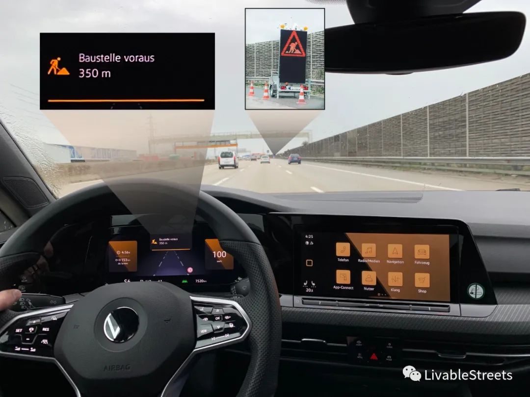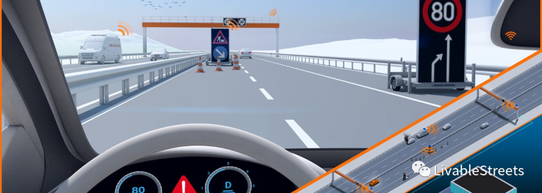 "施工現(xiàn)場(chǎng)預(yù)警“:在道路施工現(xiàn)場(chǎng)前幾百米,已經(jīng)通過C-ITS指示出了危險(xiǎn)區(qū)域。這提升了道路安全。