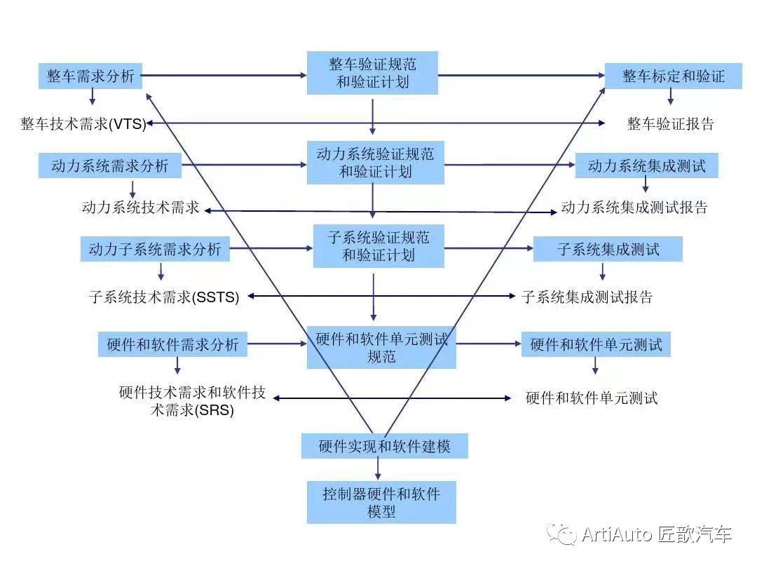 V流程來源于軟件開發(fā)過程中一個(gè)稱為快速應(yīng)用開發(fā)的模型,由于該模型的構(gòu)圖形似字母V,所以俗稱V模型。V模型是軟件開發(fā)、測試中最重要的一種模型,其大體可劃分為幾個(gè)不同的階段步驟,即功能需求、功能開發(fā)、軟件開發(fā)、軟件集成測試、功能集成測試、整車集成測試(系統(tǒng)合格性測試),如上圖所示。左邊為需求分析和設(shè)計(jì)開發(fā)的過程,右邊則為針對左邊的測試驗(yàn)證。