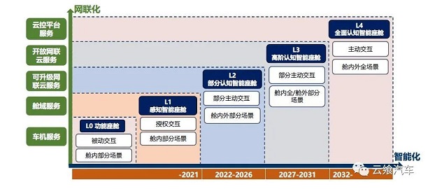 作為汽車智能化的具象體現,在智能座艙的發(fā)展中,其路線可參考下圖的規(guī)劃,當前智能座艙所處階段為L2。
