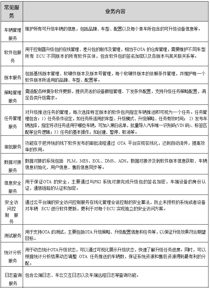 (4)業(yè)務服務層:業(yè)務服務層是 OTA 服務所有業(yè)務及相關流程管理功能在云平臺端的實現(xiàn), 除了車輛管理服務、軟件包服務、版本服務、策略管理和任務管理 5 個支撐 OTA 的核心功能外,還包括關聯(lián)系統(tǒng)審批、數(shù)據(jù)對接、信息安全服務、測試、統(tǒng)計分析、日志查詢等重要輔助功能。由于不同的企業(yè)內(nèi)部管理存在差異,云平臺所支持的輔助業(yè)務可能存在較大差異,常見服務列舉見表 2-4。