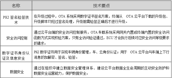 OTA 服務端以及企業(yè) IT 管理系統(tǒng)、安全服務端、web 控制臺、文件服務端 等關聯(lián)系統(tǒng),會面臨傳統(tǒng)云平臺的所有安全威脅。為保證 OTA 升級的安全性,常用安全技術如表 2-5 所示。