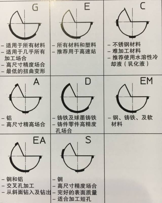 減小槍鉆內、外刃角度,即槍鉆內外刃磨的更平一些,對加工斷屑有很大的 幫助。另外,切削線速度的提高,對斷屑效果也很明顯。加工不易斷屑材料 時,槍鉆端刃可以參考如下角度: